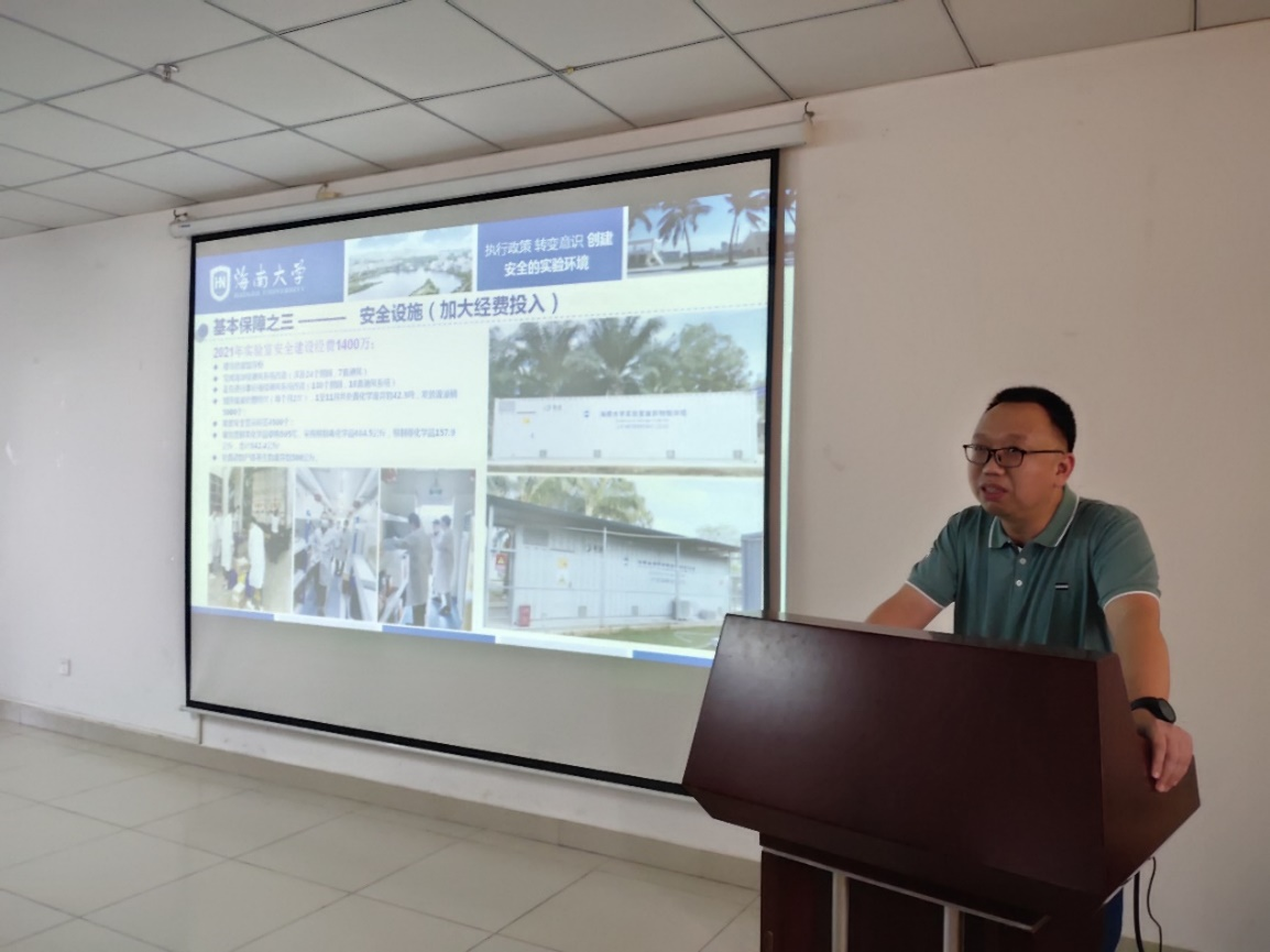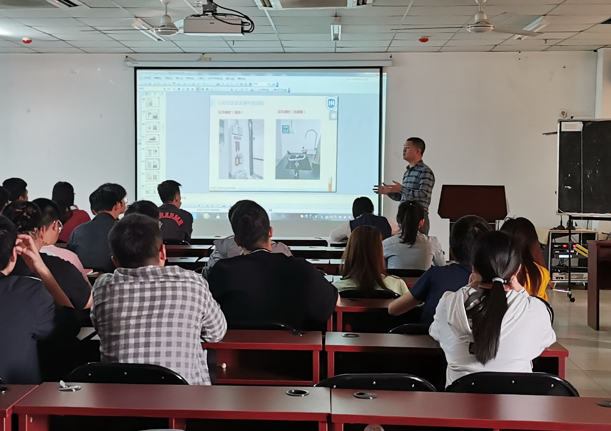 杨海峰主任对消防安全工作进行了培训,尤其是对实验室内消防器材的使用进行了详细讲解;海南省精细化工研究中心安全员李萌婷老师针对学院自查突出问题从化学品有序分类存放、五双管理、张贴二维码标签、废液区划分等方面做了整改要求。