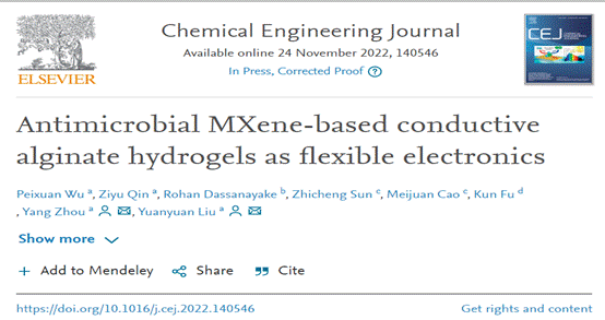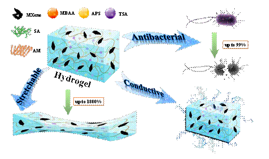 近日,海南大学化学工程与技术学院周阳教授课题组在国际权威Top期刊《Chemical Engineering Journal》(影响因子: 16.74)上发表了最新研究成果“Antimicrobial MXene-based conductive alginate hydrogels as flexible electronics”(基于抗菌MXene的导电海藻酸盐水凝胶作为柔性电子器件)。海南大学为第一单位,海南大学2020级硕士研究生吴佩轩为论文的第一作者,周阳教授和刘元元副教授为论文的共同通讯作者。该工作获得了海南省自然科学基金、国家自然科学基金和海南大学科研启动基金的支持。