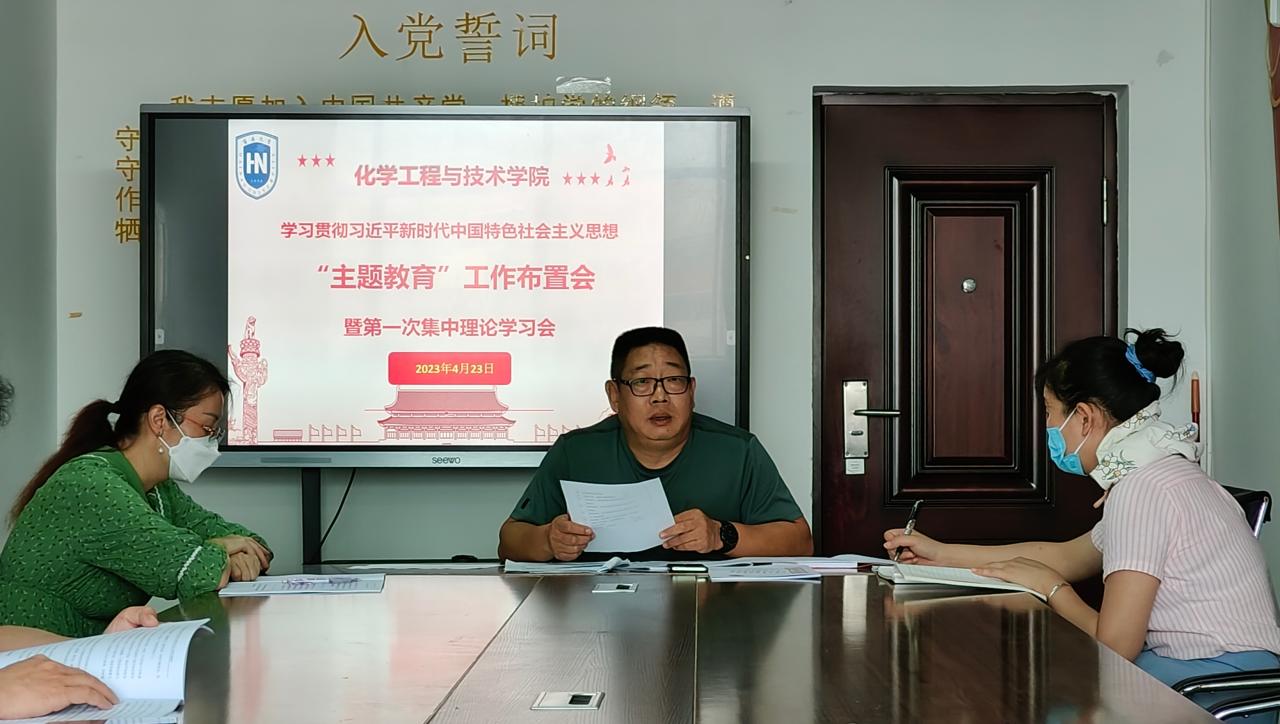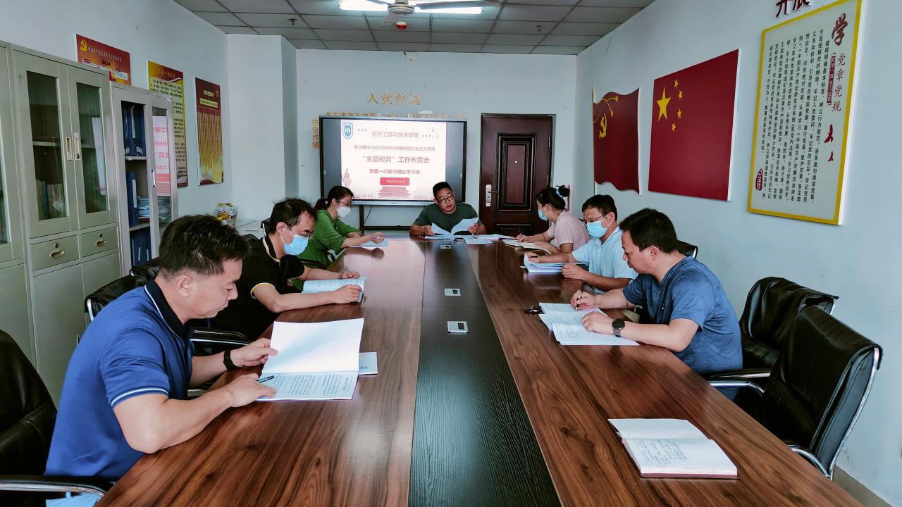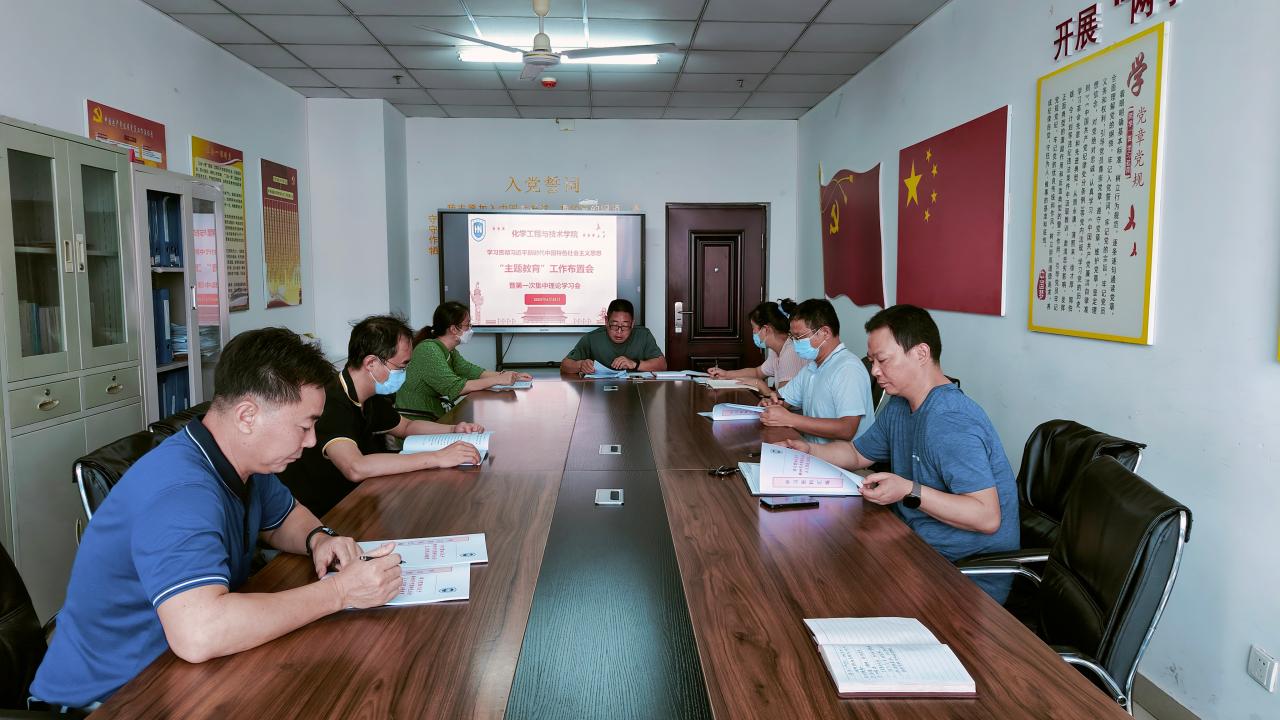 4月23日下午,在研发中心楼715会议室,化学工程与技术学院召开学习贯彻习近平新时代中国特色社会主义思想主题教育工作布置会暨第一次集中理论学习班开班。学习布置会由学院党委书记冯广波主持,学院班子成员、党委委员及基层党支部书记参加。