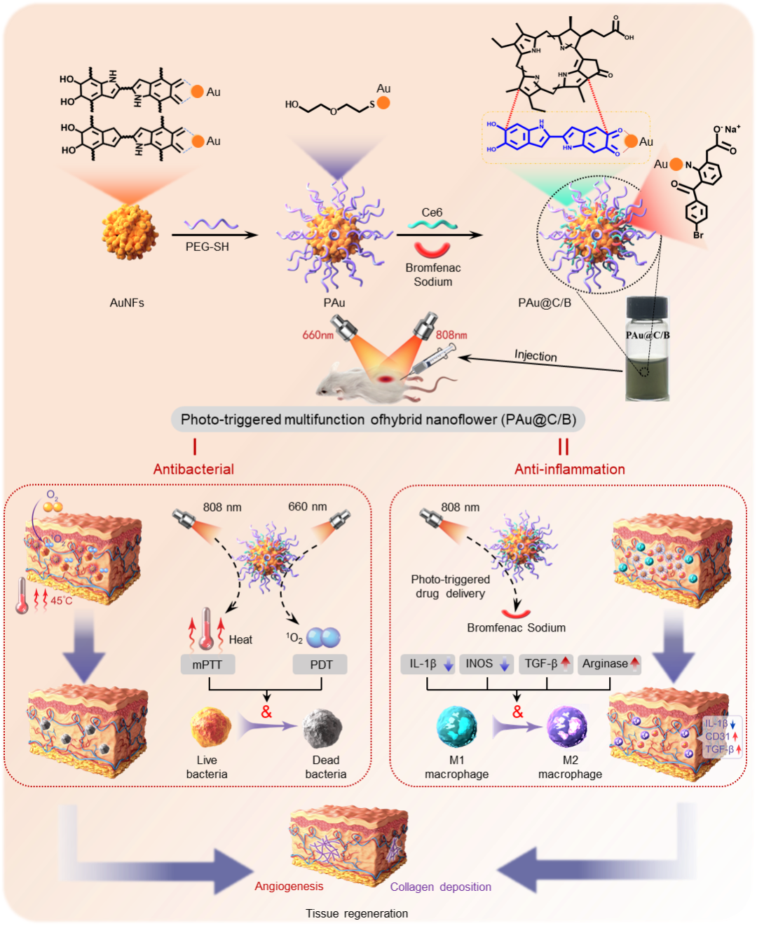 为此,设计了一种在光激发下具有光热/光动力/药物控释的多功能复合金纳米花颗粒,在温和光热(~45℃, mPTT)/光动力(PDT)联合治疗下有效抑制感染,协同非缁类抑炎药物调节免疫微环境,促进感染性组织愈合(图1)。