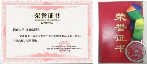 本站讯(记者 朱莉)8月15日至18日,第十三届全国大学生化学实验竞赛总决赛在山东大学中心校区(济南)举行。据悉,本次比赛共有来自全国128所高校的173名学生参赛,海南省共4名学生入围。海南大学首次参赛,本届参赛队伍由我院基础化学实验教学中心朱莉老师(指导老师)、林塬老师带队。经过两天的角逐,我院2021级应用化学专业鬲莆欣同学斩获全国二等奖、省级一等奖的佳绩。