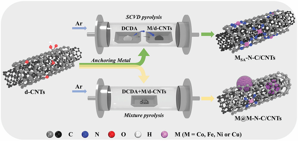 针对酸性环境下电催化剂稳定性差、氧还原反应动力学缓慢等关键问题,yl9193永利官网功能分子器件团队提出了一系列创新设计策略,以精准调控氧物种在活性位点上的吸附与还原行为。团队发展了一种基于“分离气相化学沉积”的普适性方法,在碳纳米管载体上构筑同轴钴-氮-碳单原子催化剂。所制备的同轴结构单原子催化剂在酸性电解液中展现出优异的氧还原活性、选择性与长期稳定性,实现了超过100小时的稳定高效电合成过氧化氢性能。相关成果以Coaxial Metal-Nitrogen–Carbon Single-Atom Catalysts Boost Acid Hydrogen Peroxide Production为题发表于材料领域中国科学院一区TOP期刊Advanced Functional Materials杂志,yl9193永利官网,9193官网张建教授、卢兴教授为该论文的通讯作者。