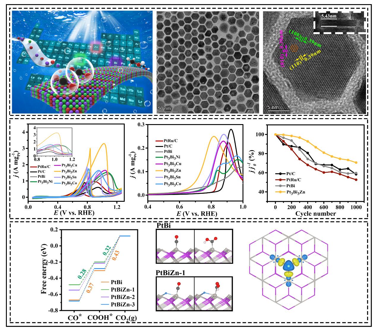田新龙教授团队提出通过在二元PtBi系统中,引入具有能够活化水性能的M(Co、Ni、Cu、Zn、Sn)作为第三种成分,并采用一种简单通用的溶剂热合成方法,制备三元PtBiM纳米片(NPLs)。其中,PtBiZn纳米片展现了最高的MOR活性(3.29 A mg-1Pt)和耐久性。作者进一步通过DFT计算表明了第三种成分的加入能够调节催化剂表面的Pt的电子结构,使催化剂具有更好的耐毒性。为了探究PtBiZn NPLs性能提高的原因,对催化剂展开了DFT计算。综合考虑了Zn原子3种可能掺杂配置情况并构筑理论计算模型。通过计算表面铂原子的d带中心(εd),与原始PtBi相比,在表面上沉积Zn原子导致相邻Pt原子的d轨道密度下移且更负,表面CO吸附能(1.73 eV)小于PtBi表面的吸附能(1.96 eV)。这些计算证据表明,将Zn原子引入PtBi表面能够进一步调节Pt电子结构和中间体(CO)的结合强度,从而增强了催化剂催化性能和抗中毒能力。