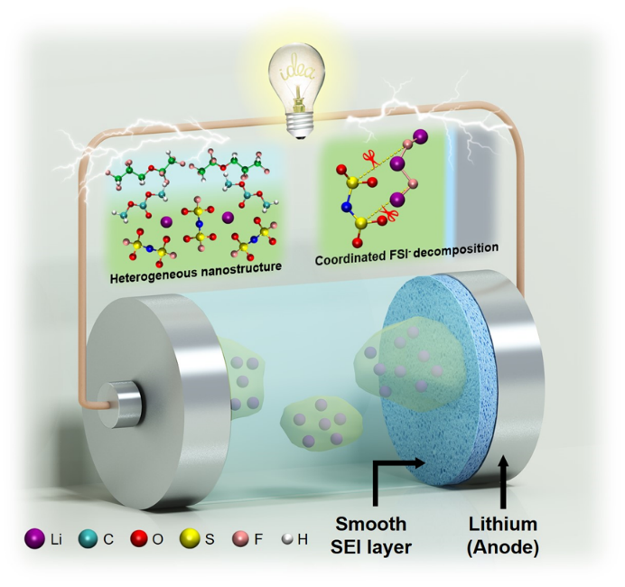 在该研究论文中,作者通过实验表征与理论模拟相结合的方式系统研究了局部高浓电解液(Localized high-concentration electrolytes, LHCEs)中电解液异质性与SEI形成过程的关联。研究发现,与低浓、高浓电解液相比,局部高浓电解液具有更优的循环稳定性,并且经过长时间循环后界面阻抗相对较低,表明氟代醚类稀释剂的引入有效抑制了碳酸酯类溶剂与锂金属的副反应,促进了稳定SEI层的形成,增强了锂金属与电解液之间的界面稳定性。进一步对电解液微观结构与SEI层形成过程的关联分析表明,在LHCE体系中形成的SEI层更为光滑致密且氟含量相对较高,进而使得LHCE体系循环稳定性显著提升。在常规的载流子溶剂化结构分析之外,该研究着重强调了电解液微观结构调控与界面反应过程之间的关联性,为SEI层性能优化提供了新的研究思路。