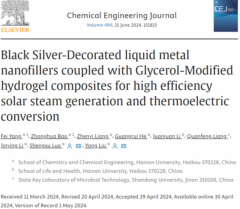 太阳能驱动的界面蒸发(SDIE)在缓解全球淡水短缺方面具有巨大的潜力,这需要设计高效的能源转换装置。 近日,yl9193永利官网污染控制与先进材料研究团队在化工学科Top期刊Chemical Engineering Journal (中国科学院一区,IF=15.1)在线发表题为“Black Silver-Decorated liquid metal nanofillers coupled with Glycerol-Modified hydrogel composites for high efficiency solar steam generation and thermoelectric conversion”的研究论文,在高效太阳能驱动海水淡化和协同热电联产方面取得新进展。