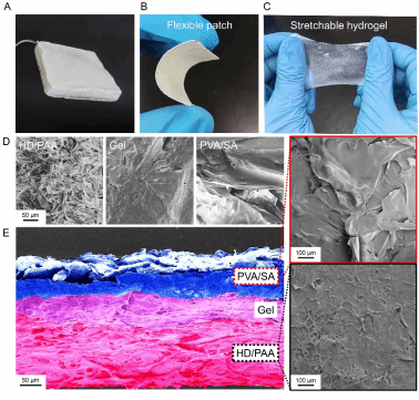 图2. HGP贴片的表征。(A-B)贴片的光学照片。(C)贴片水化后形成可拉伸水凝胶。(D)贴片各层结构的SEM图像。(E)贴片断面的SEM图像。