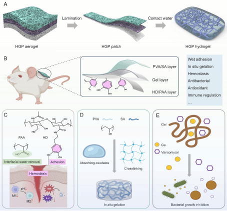 HGP贴片包含三层结构(图1-图2):底层为湿性粘附层,由多巴胺接枝透明质酸(HD)和聚丙烯酸(PAA)组成;中层为药物负载层,由明胶(Gel)组成;顶层为非粘附性凝胶化层,由聚乙烯醇(PVA)和海藻酸钠(SA)制成。PAA可去除界面水,增强贴片对组织的粘附性。HGP贴片通过两步工艺制备:首先,各层溶液冻干成气凝胶;然后,采用机械层压工艺制造敷料(图1A-1B)。接触伤口后,HD通过儿茶酚介导的相互作用牢固粘附于组织表面,而PAA去除界面水分后进一步增强了粘附力(图1C)。气凝胶随后吸收创面渗出液,导致明胶层溶解释放药物,并通过物理交联使PVA/SA层水化形成水凝胶敷料(图1D)。