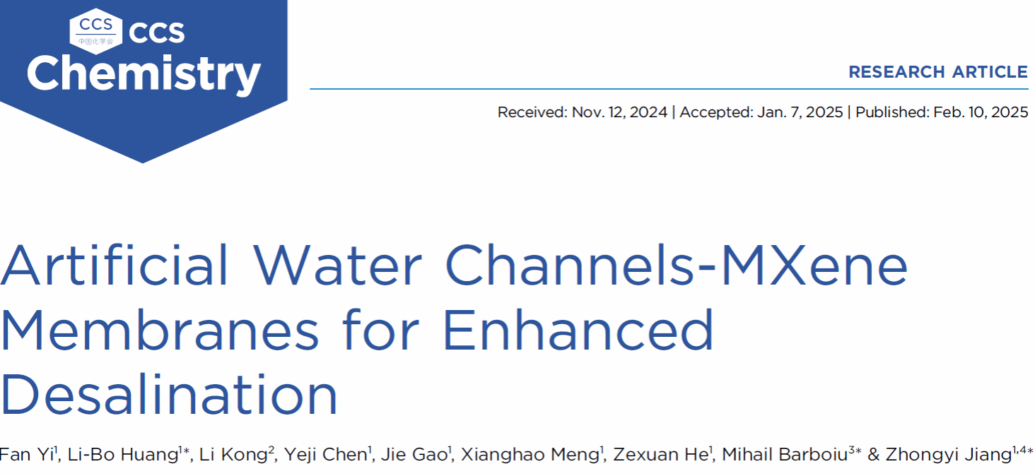 近期,姜忠义教授课题组在中国化学会创办的高水平旗舰期刊《CCS Chemistry》(IF = 9.4)在线发表题为“Artificial Water Channel-MXene Membranes for Enhanced Desalination”的研究论文。我院博士研究生易凡为论文第一作者,教育部客座教授姜忠义教授、海南大学黄礼博副教授和法国国家科学研究中心Mihail Barboiu教授为论文共同通讯作者。