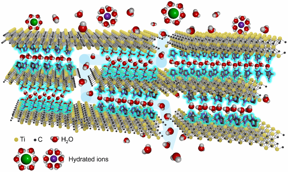 MXene作为一种新型二维过渡金属碳/氮化物材料,具有高比表面积和丰富的表面官能团,在水处理领域展现出独特优势。其片层结构使其能堆叠形成层状膜,理论上可实现精准的分子筛分。然而,在实际水处理过程中,MXene二维膜因其亲水性强导致溶胀现象,造成层间距膨胀,严重影响其分离性能。人工水通道(AWCs)受生物水通道蛋白启发设计,相比而言具有更强的物理和化学稳定性,且与多种合成材料的兼容性更好,其模块化设计特性更便于与聚酰胺、石墨烯等基体材料复合构建高性能仿生复合膜。AWCs的超分子结构具有精确设计的水传输通道(直径约为3 Å,不仅可实现水分子单链式或水分子簇式快速传输,还能通过空间位阻和电荷排斥效应实现完全离子排阻,在水处理膜等领域具有广阔的应用前景。